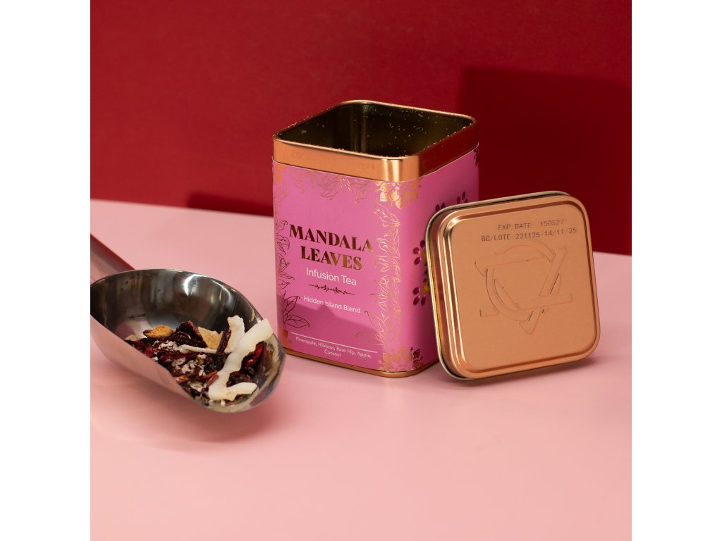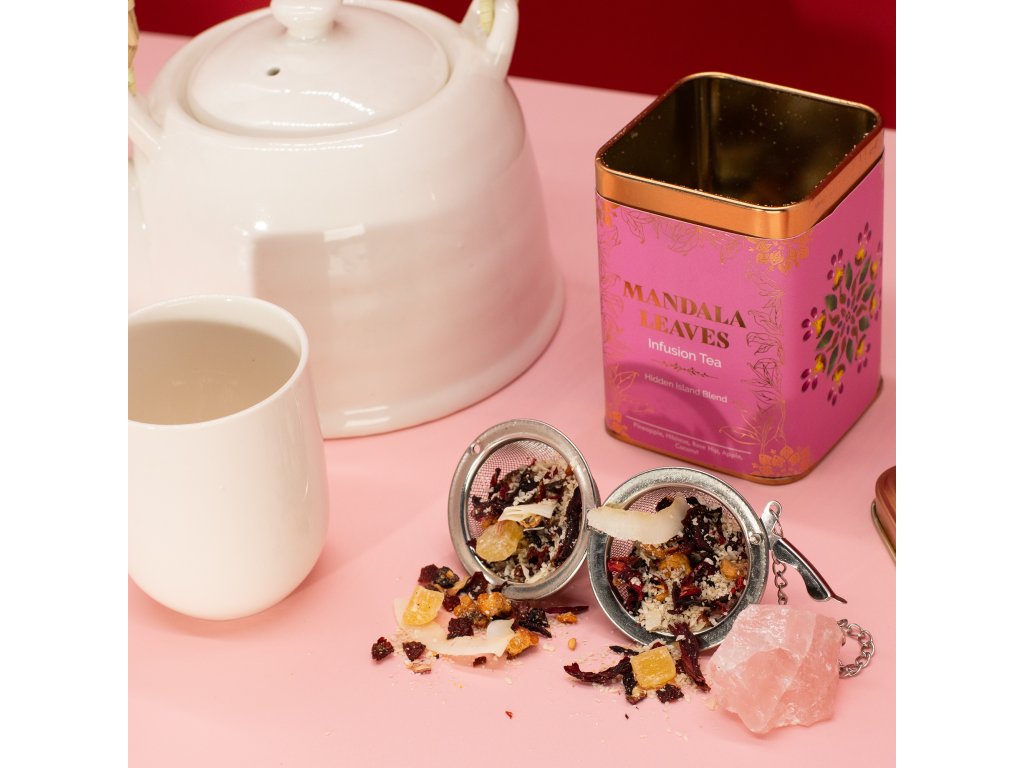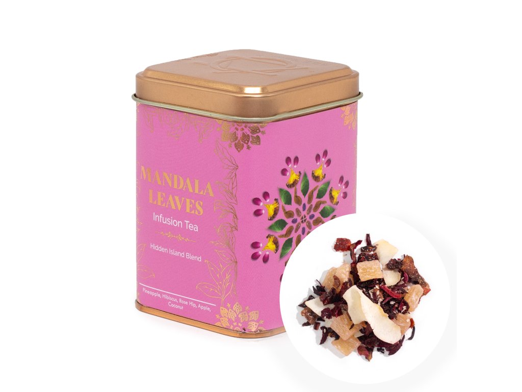 Směs Skrytého Ostrova je lehká ovocná čajová kompozice inspirovaná tropickými chutěmi a slunečnou atmosférou vzdálených ostrovů. Spojení exotického ovoce, květů a jemného kokosu vytváří osvěžující nálev s krémovým nádechem.